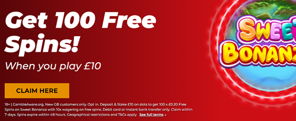 18+ | GambleAware.org. New GB customers only. Opt in. Deposit & Stake £10 on slots to get 100 x £0.20 Free Spins on Sweet Bonanza with 10x wagering on free spins. Debit card or instant bank transfer only. Claim within 7 days. Spins expire within 48 hours. Geographical restrictions and T&Cs apply. See full terms